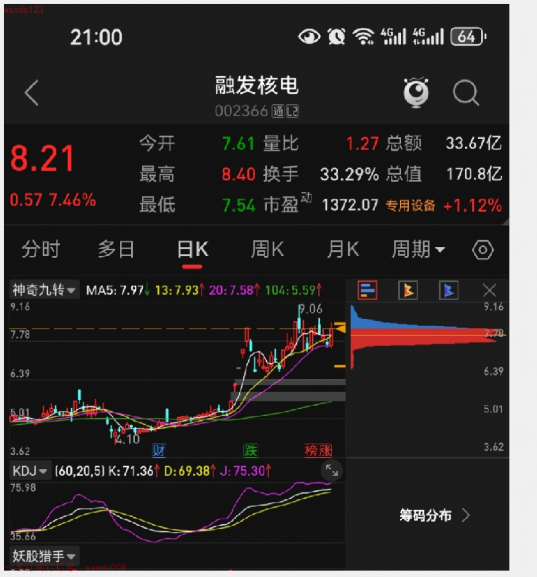 三、当前状态提示 文中提到 “看它的死叉还没出现”,即当前 KDJ 指标尚未形成死叉,暂未触发卖出信号。