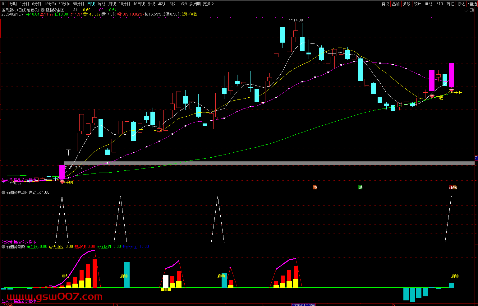- 新趋势主图:整合多周期均线、量价异动模型及放量突破特征,识别首次拉升信号,以紫色 K 线 +“— 干吧” 标识提示介入参考点;